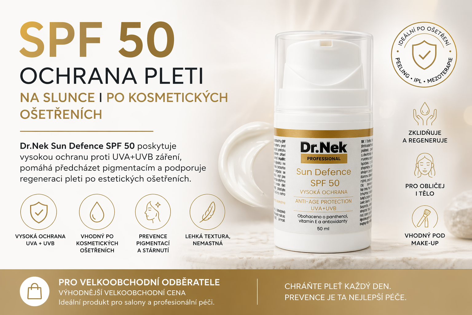 Dr.Nek Sun Defence SPF 50 poskytuje vysokou ochranu proti UVA + UVB záření a je navržen tak, aby pokožku nejen chránil, ale zároveň podporoval její komfort a vzhled.