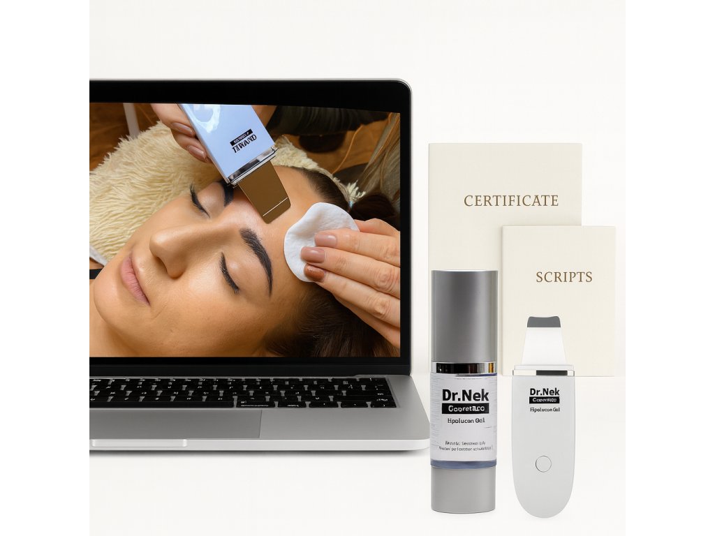 Dr.Nek Ultraschallspatel mit Videokurs, Skripten und Zertifikat und Dr.Nek 3 % Hyaluronsäure-Serum.