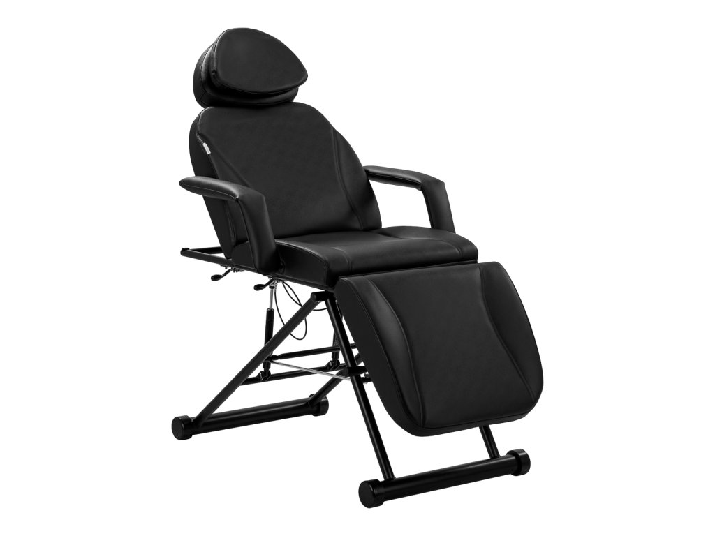 The base of the chair has a fixed height, so the seat remains at the same level to ensure comfortable use. A sturdy metal frame in black shades provides necessary stability. The extendable headrest, which can be pulled out by approximately 15 cm, provides excellent head support regardless of the client's height. This allows for various treatments to be performed freely in the fields of cosmetology, physiotherapy, or tattooing.