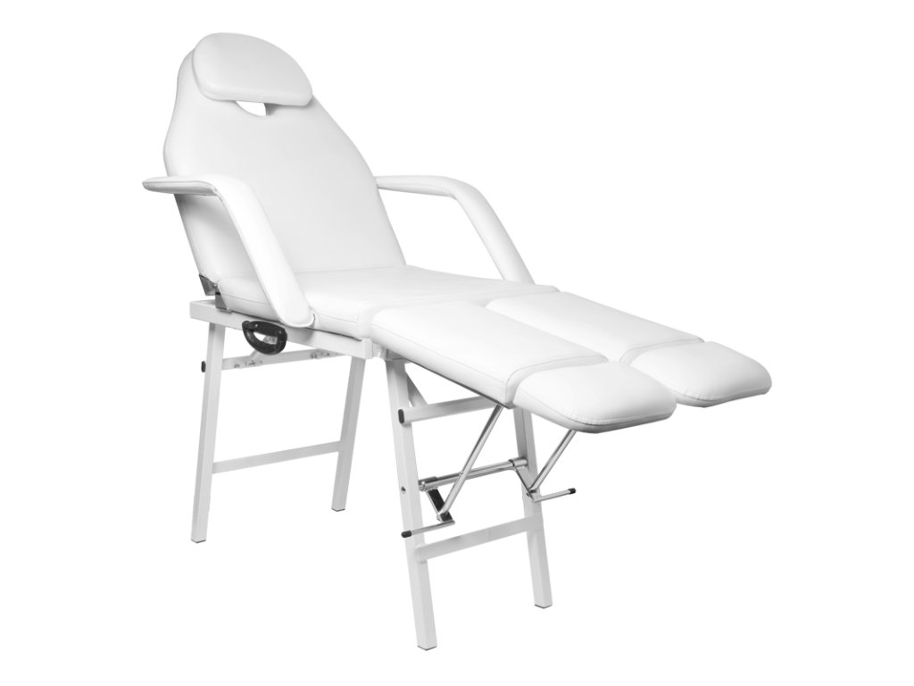 The P270 Pedi Folding Beauty Chair in white is a practical solution for space-limited salons or mobile beauty services. Its folding design allows easy storage out of the workspace. It features manual backrest and footrest adjustments, removable armrests and headrest. Upholstered in quality eco-leather, it feels pleasant to touch, is easy to clean, and resists common disinfectants. Despite its compactness, it offers ample comfort for both client and operator.